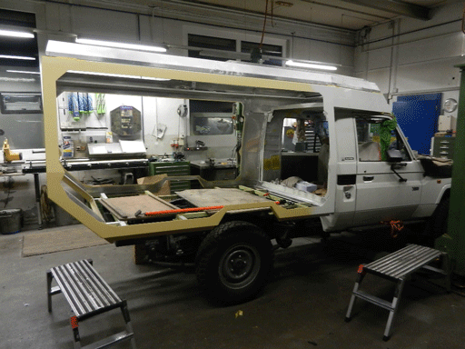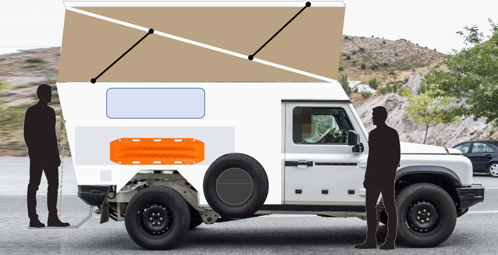 2 seater with large indoor living space but not larger than my LC 79 - must fit in shipping container. Here is a rough sketch of the plan. It's a Grenadier cut behind the driver and co-driver door with a custom cabin stretching to the far back. Queen size bead fully lifted, like the pop-up roof. Back step for storing outside table, theft protection and for easy entry into cabin. Two spare wheels on both sided as tire choice will not be available in all countries (that is why we want to carry 2 spares). Read more below :-)