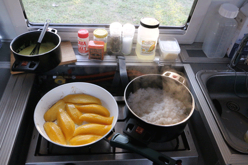 Stove: 2x Induction single plate (allowing us to cook inside and outside at the same time)
